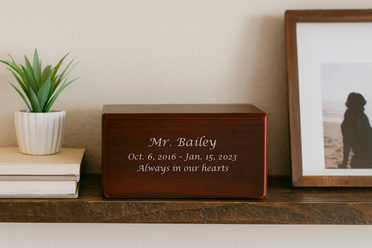 Wooden urns offer a compelling choice for those seeking an economical and personalized memorial option. With a timeless appeal, these urns provide a dignified resting place while allowing families to add a personal touch through various customization options. The natural warmth of wood adds a comforting element to the memorial, creating a meaningful tribute to a loved one's memory. With our laser engraver we are able to personalize these urns to match the unique personality of your pet.
